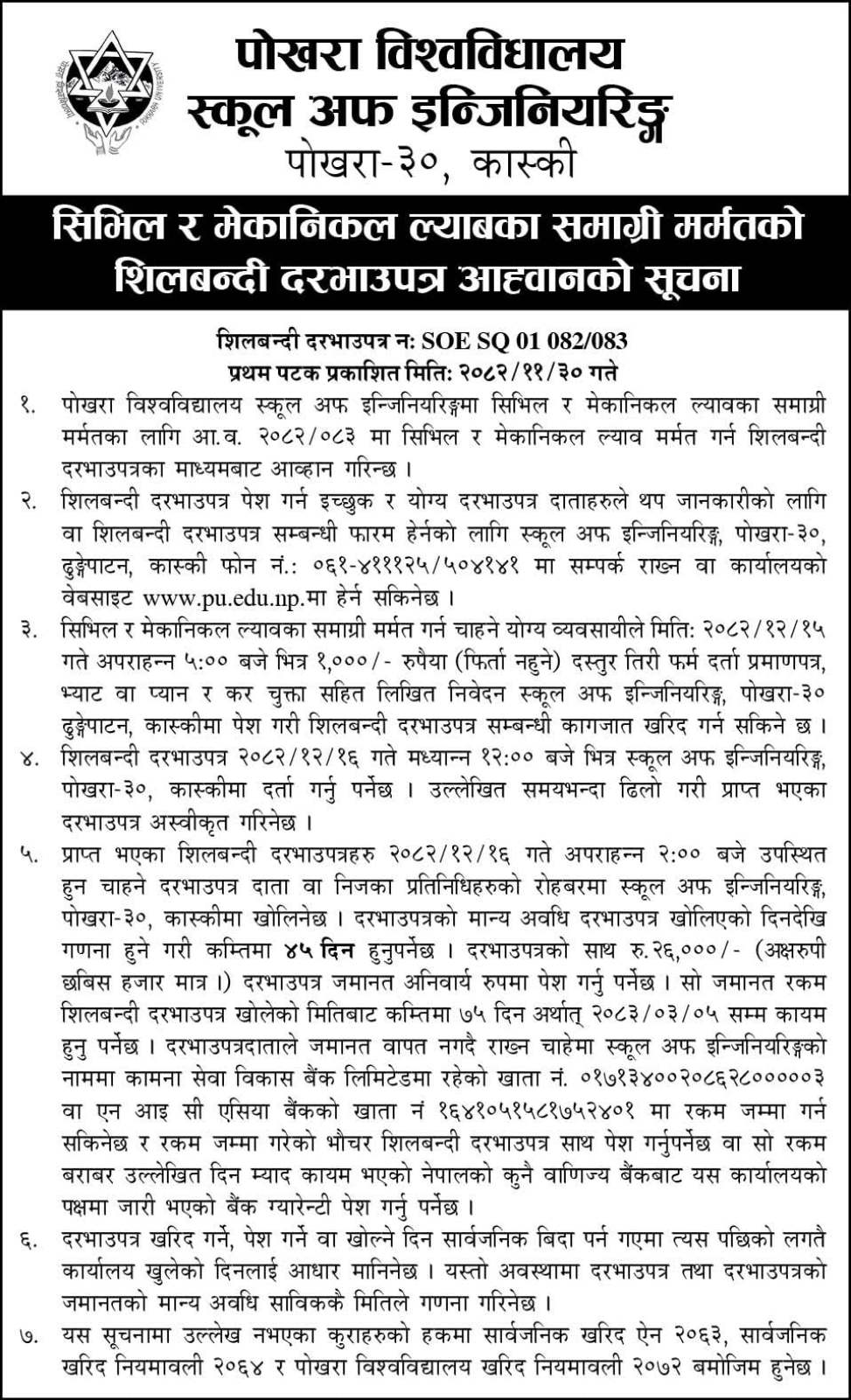 - सिभिल र मेकानिकल ल्याबका सामाग्री मर्मतको शिलबन्दी दरभाउपत्र आह्वानको सुचना !