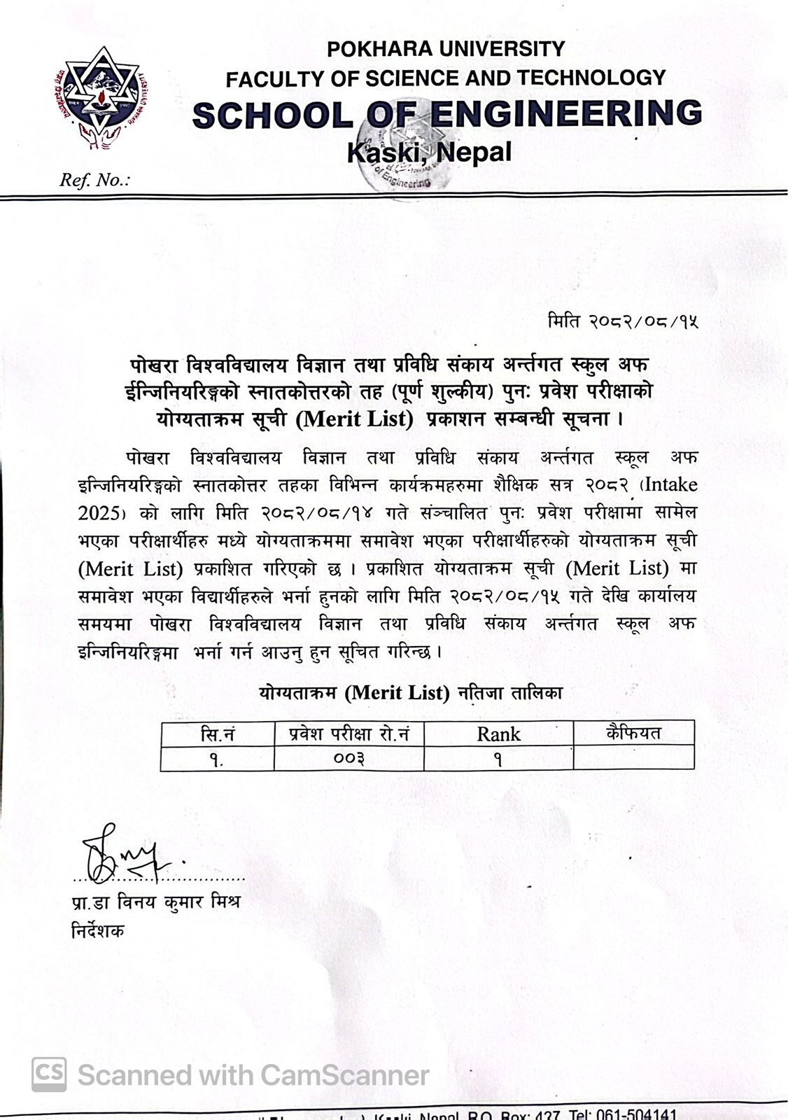 - स्कुल अफ इन्जिनियरिङ्ग, स्नातकोत्तर तह(पूर्ण शुल्कीय) पुनः प्रवेश परीक्षाको योग्यताक्रम (Merit List) प्रकाशन सूचना।