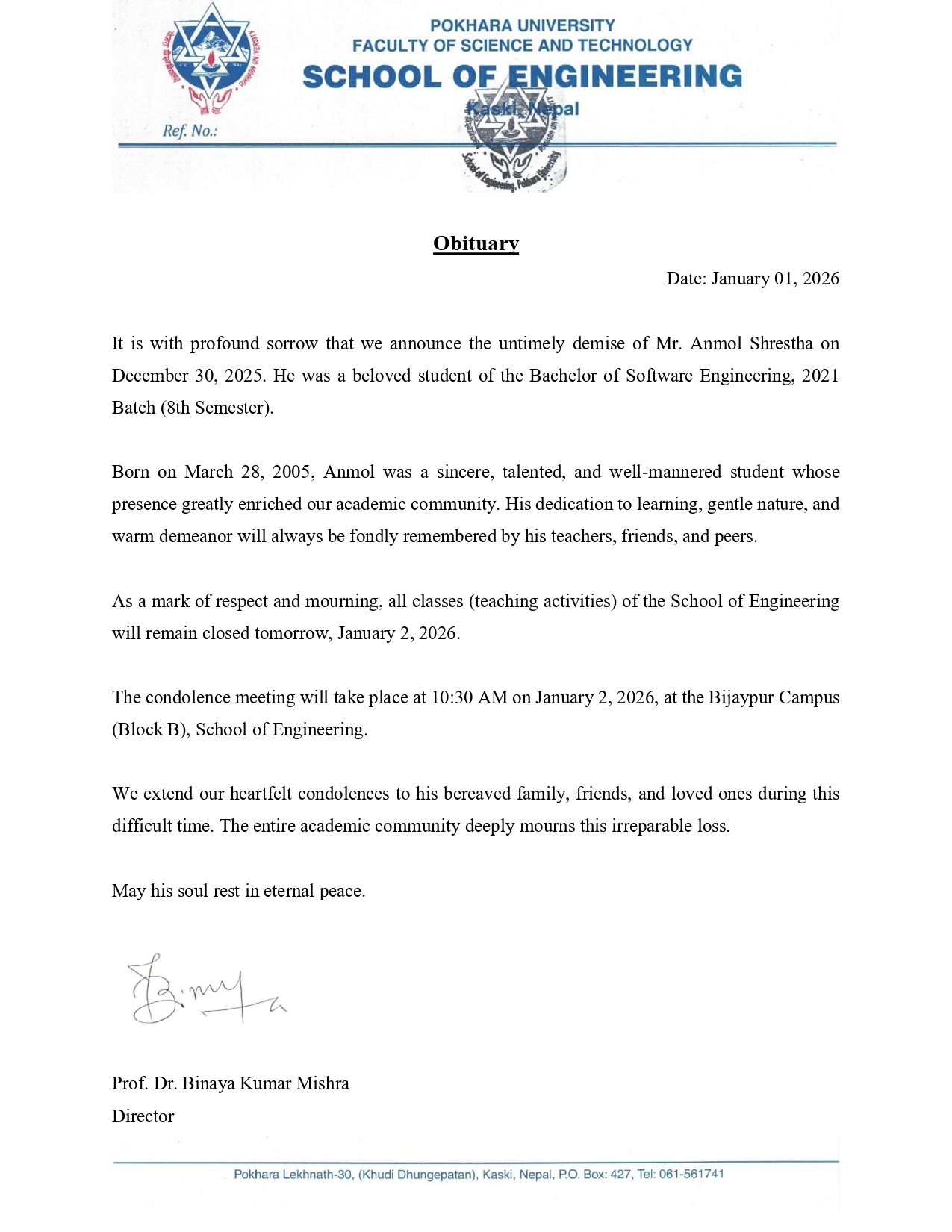 - स्कुल अफ ईन्जिनियरिङ्गको स्नातकोत्तर तह तथा स्नातक तहमा (पूर्ण शुल्कीय) पुनः भर्ना सम्बन्धी सुचना ।